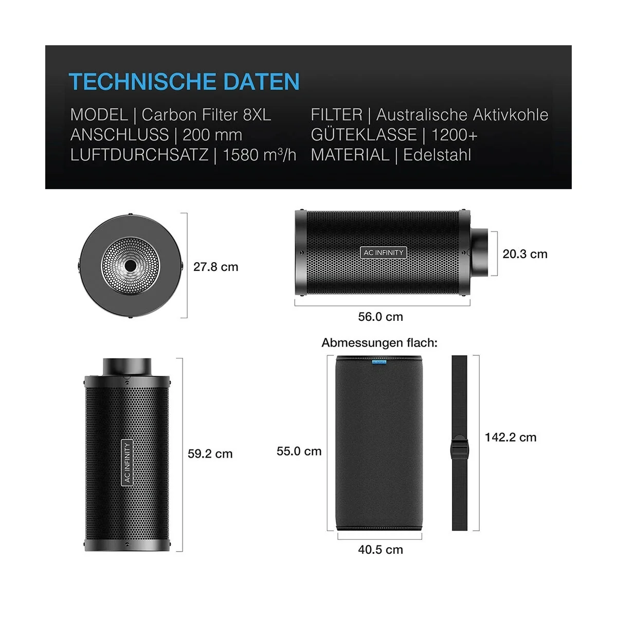 Produktinformationen "AC Infinity - Aktivkohlefilter 200 mm, 1580 m3h Abluftfilter Growbox"