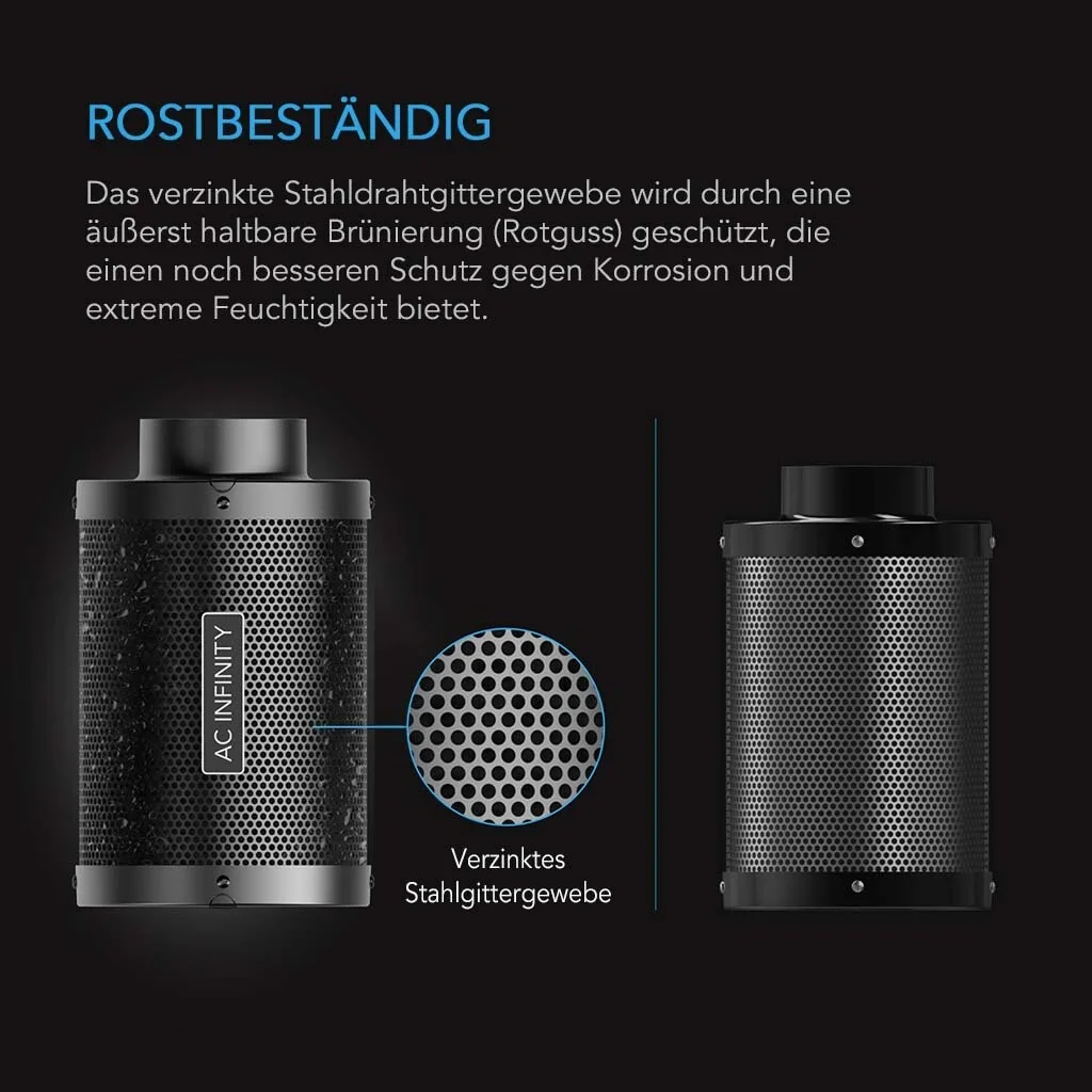 Der Aktivkohlefilter XL mit 200 mm Anschluss sorgt in Growzelten, Hydrokultur-Räumen und anderen anspruchsvollen Belüftungsprojekten für saubere, geruchsfreie Luft. Die verwendete australische Virgin-Aktivkohle (RC412) mit hohem IAV-Wert gewährleistet eine starke Adsorption von Gerüchen und Chemikalien. Das extra dicke Kohlebett im XL-Format fördert einen hohen Luftdurchsatz und eine konstante, langlebige Filterleistung.