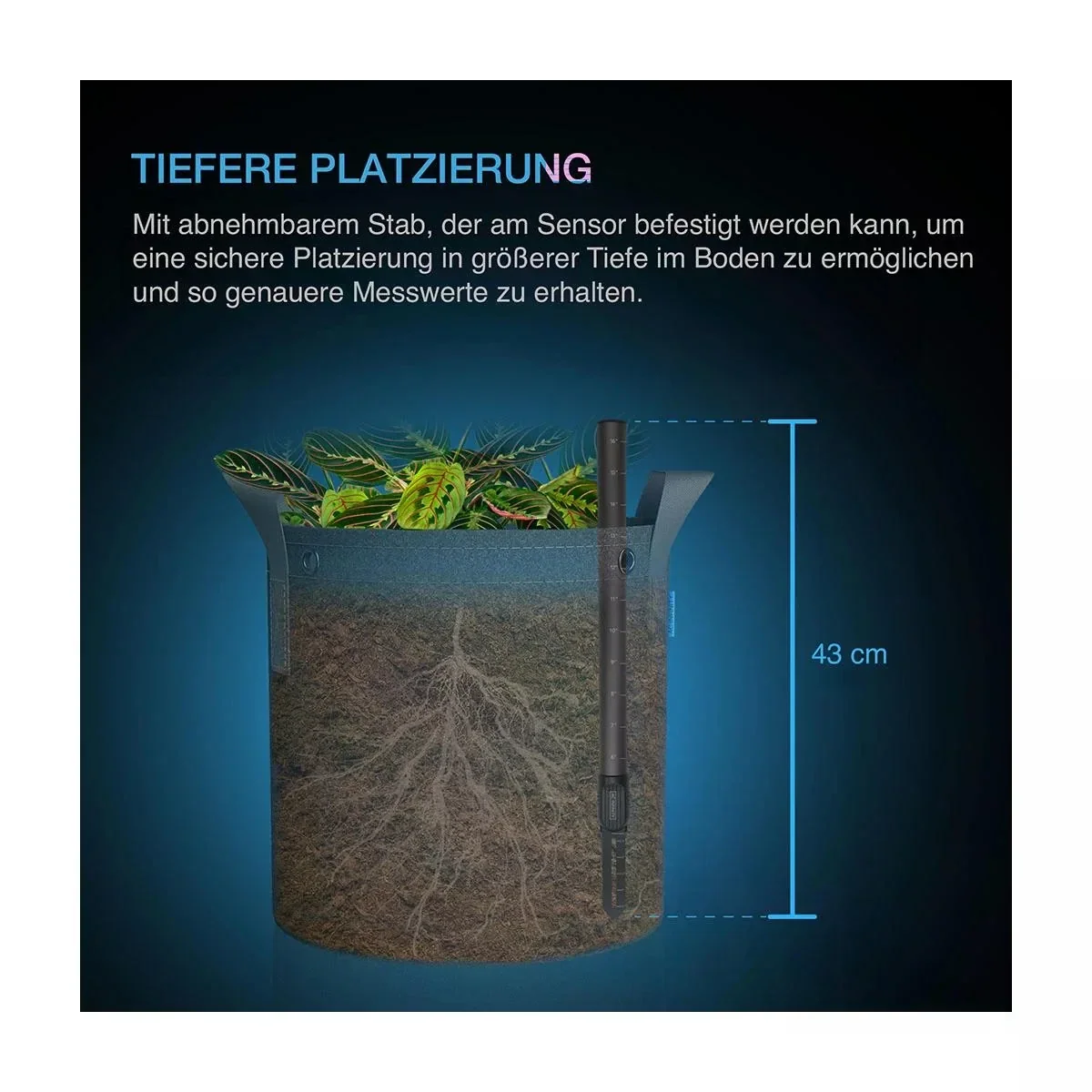 - Sanfte Platzierung: Abnehmbarer Schaft erlaubt tiefe Positionierung im Substrat, ohne Wurzeln zu verletzen.