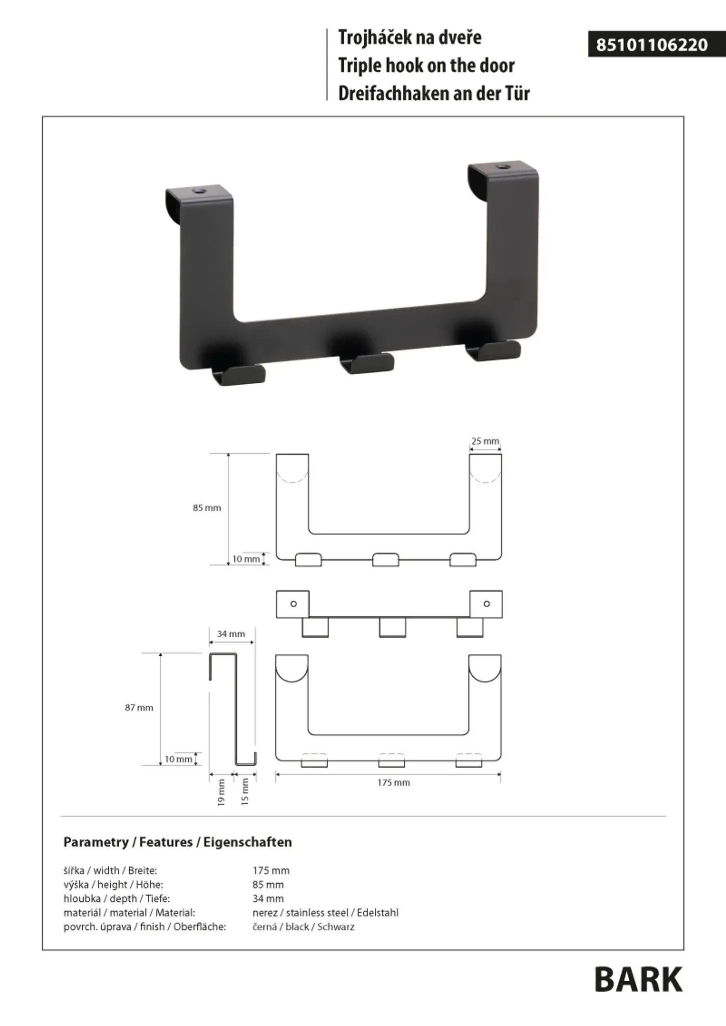 Produktinformationen "BARK Dreifachhaken Edelstahl Schwarz"