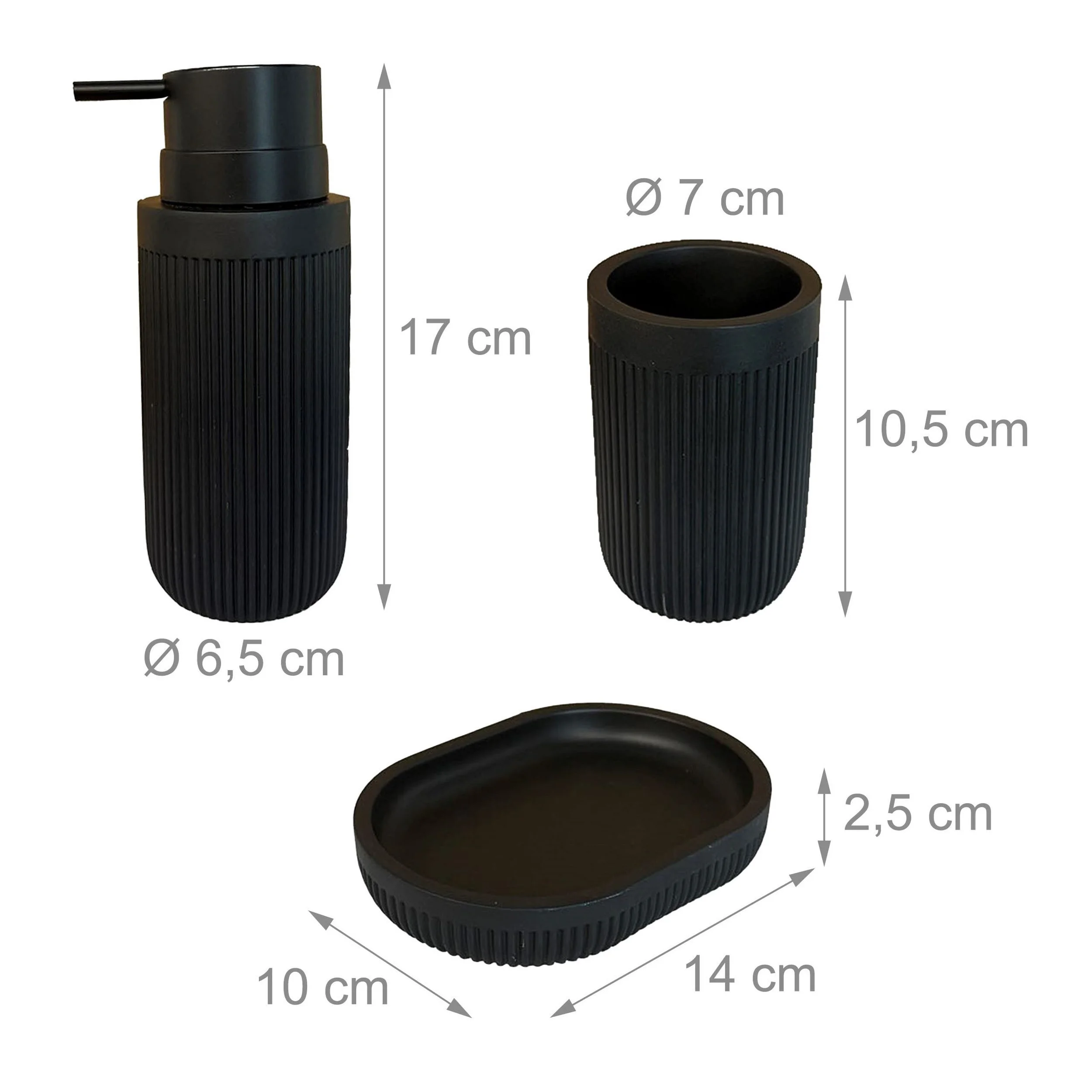 Mit diesem eleganten 3-teiligen Badaccessoire-Set aus schwarzem Polyresin richtest du dein Badezimmer stilvoll ein. Die dekorativen Accessoires überzeugen durch robuste Verarbeitung, pflegeleichte Materialien und eine elegante Steinoptik mit geriffelter Oberfläche. Perfekt abgestimmt für Seife, Zahnbürsten und Zahnpasta.