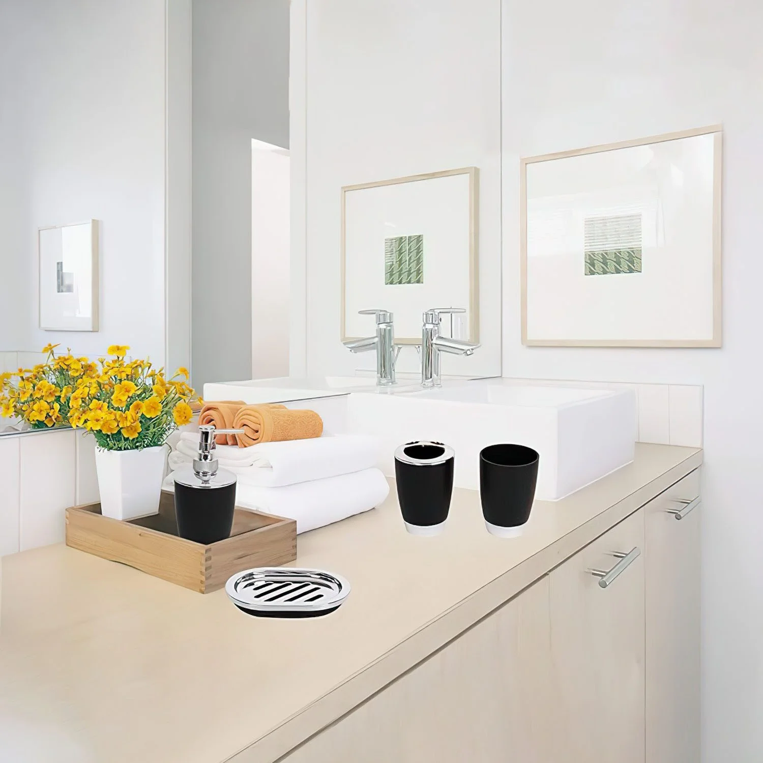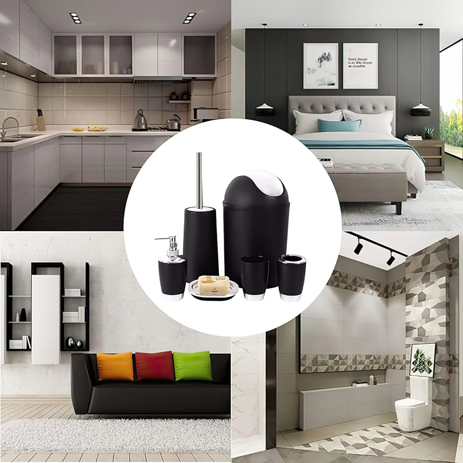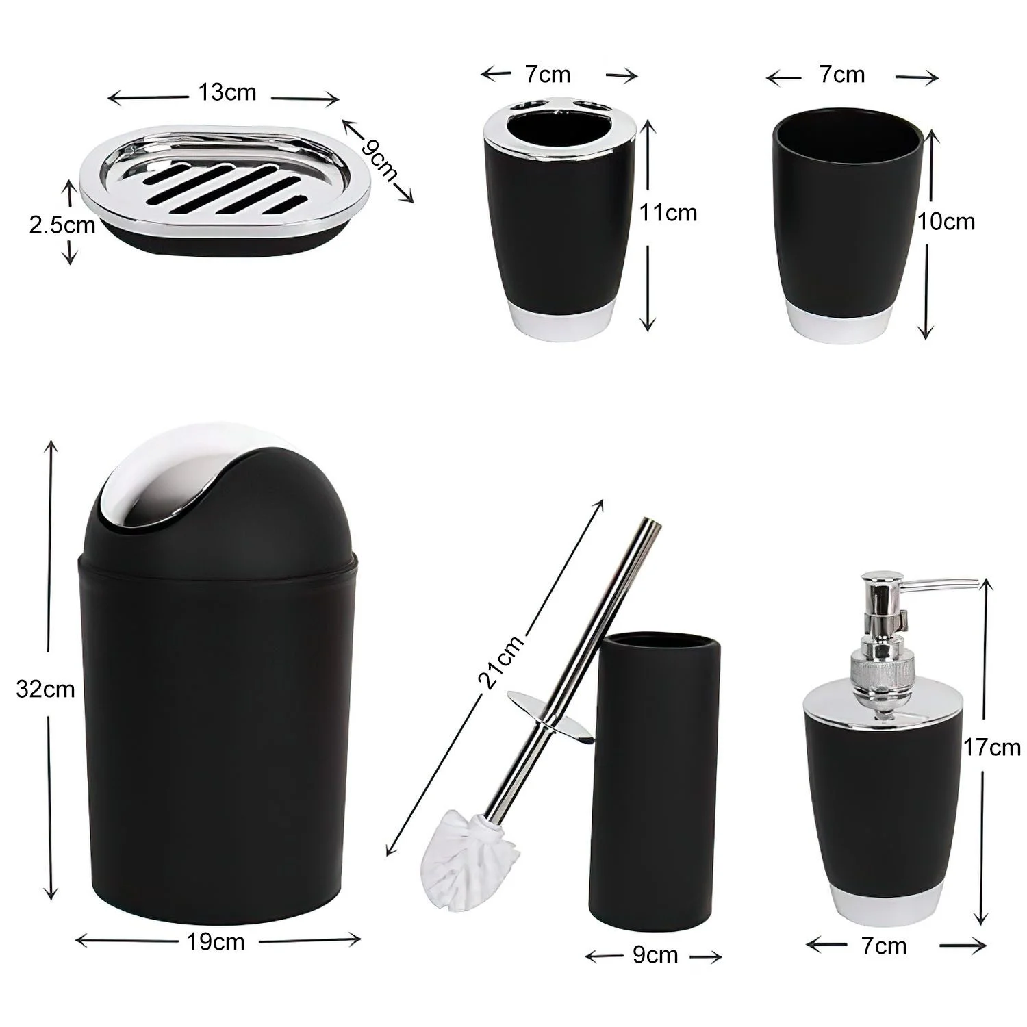 Dieses moderne 6-teilige Badezimmer-Set in Matt-Schwarz bietet umfassende Funktionalität und stilvolles Design. Hergestellt aus langlebigem PP-Kunststoff und Edelstahl mit rutschfester, gummierter Oberfläche, vereint es Eleganz, Hygiene und Organisation. Ideal für Zuhause, Gäste-WC, Hotel oder Schlafsaal.