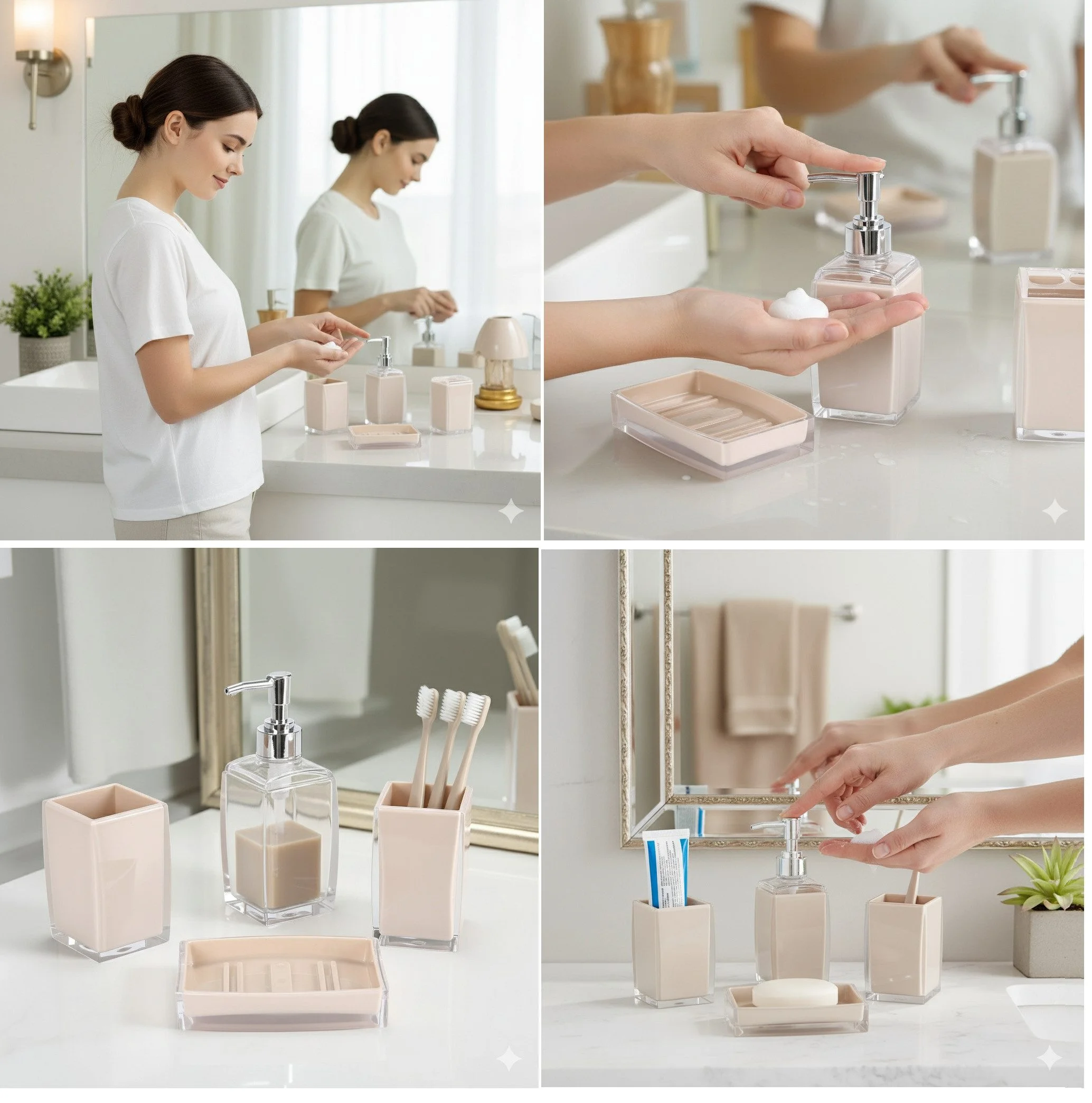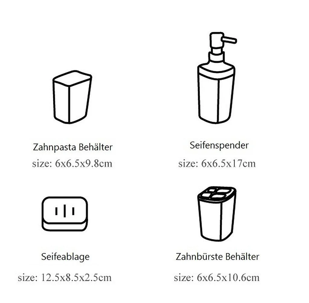 - Set-Inhalt: Seifenspender, Zahnputzbecher / Zahnbürstenhalter, Seifenschale, zusätzlicher Organizer-Becher