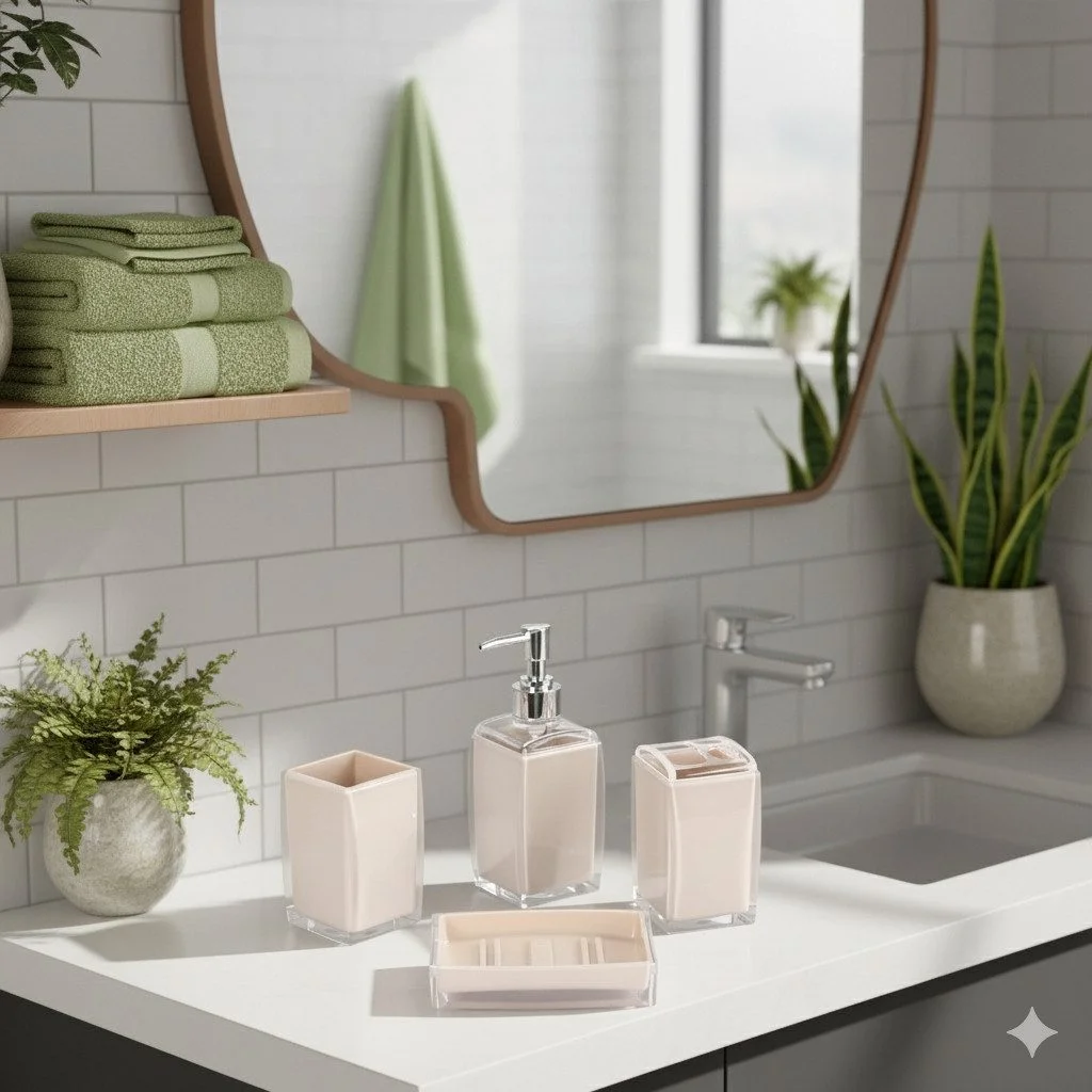 Das 4-teilige Badaccessoire-Set Cheffinger in Beige vereint Eleganz, Funktionalität und Hygiene. Ideal für stilvolle Organisation im Badezimmer – von Seife über Zahnbürsten bis hin zu kleinen Badutensilien. Hochwertige, langlebige Materialien sorgen für einfache Reinigung und langanhaltende Nutzung.