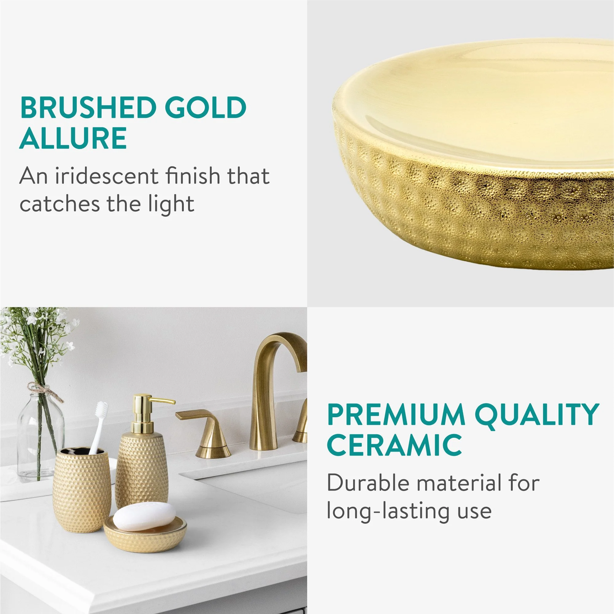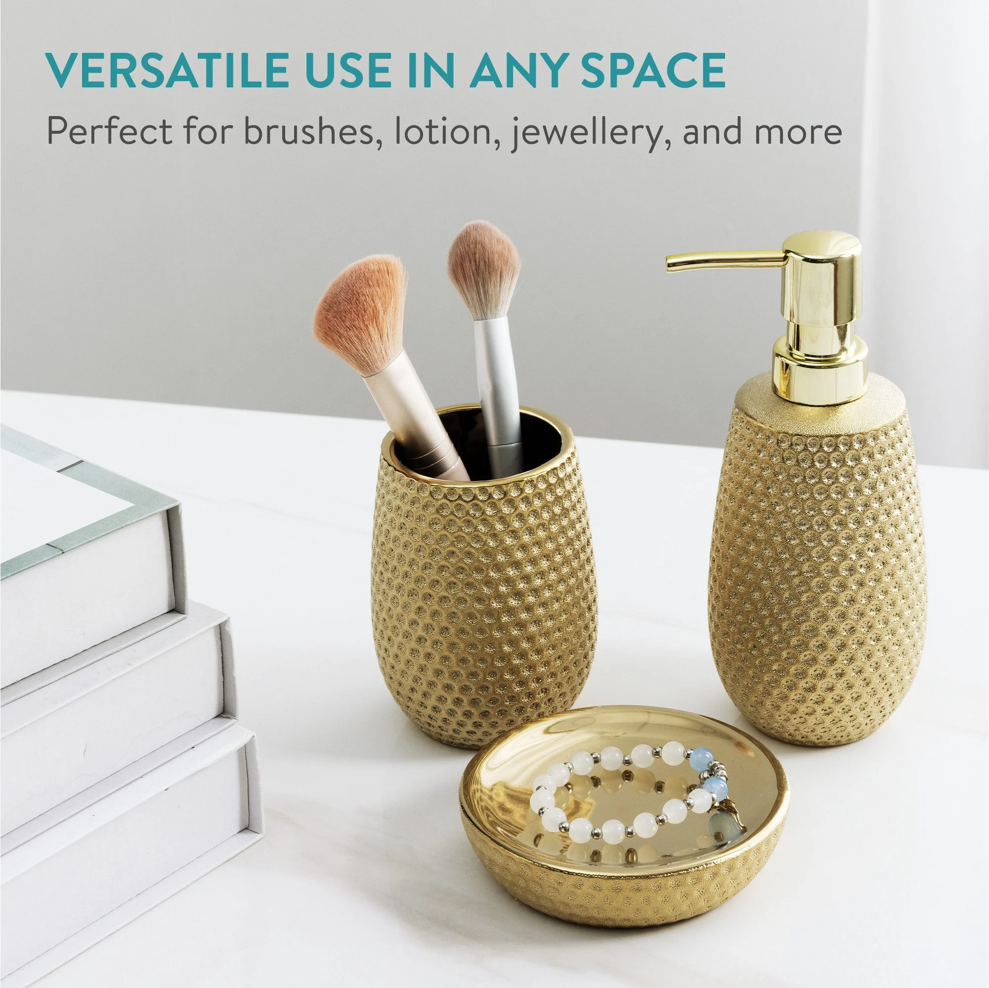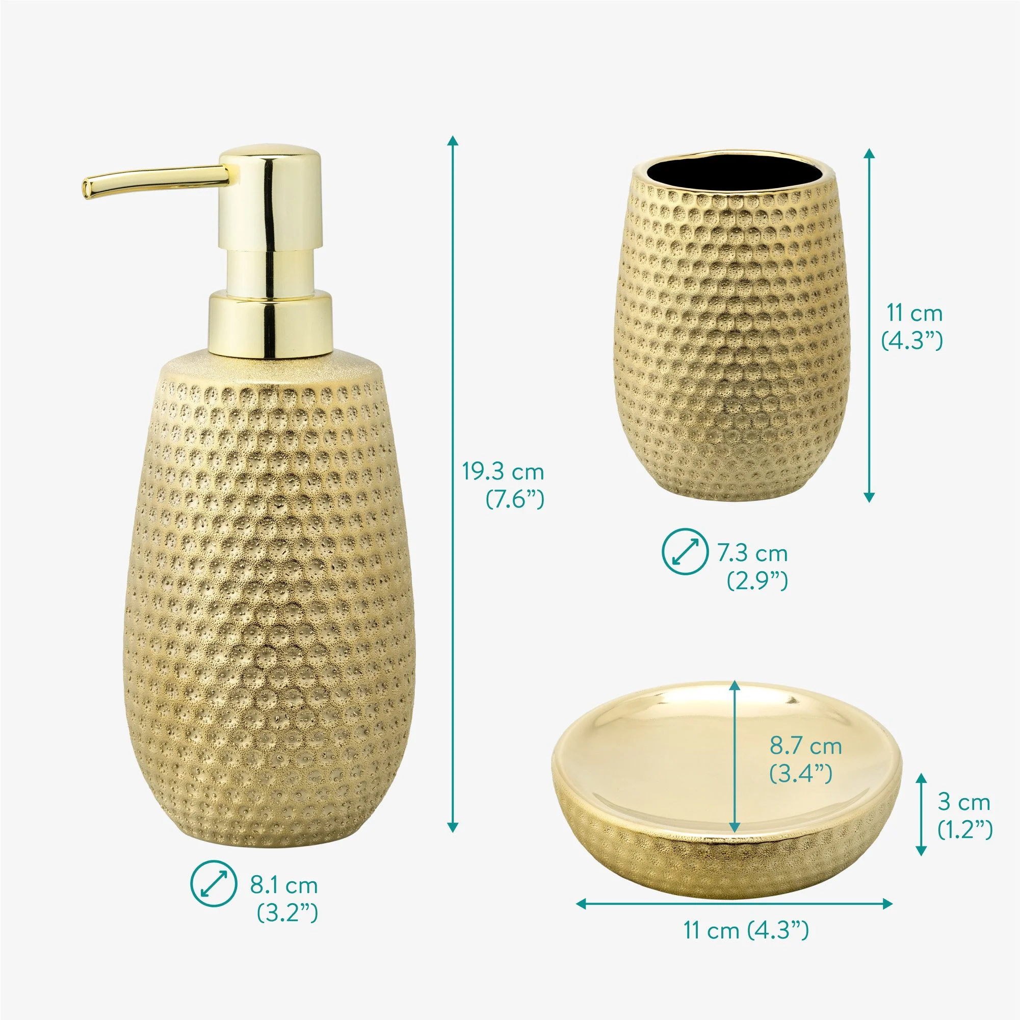Verleihe deinem Badezimmer eine elegante und harmonische Note mit dem Premium Badaccessoire-Set in edlem Gold. Das 3-teilige Set besteht aus einem Seifenspender, einem Zahnputzbecher/Zahnbürstenhalter und einer Seifenschale. Alle Teile sind aus hochwertiger Keramik gefertigt, langlebig und leicht zu reinigen – perfekt für ein luxuriöses Badezimmerambiente.