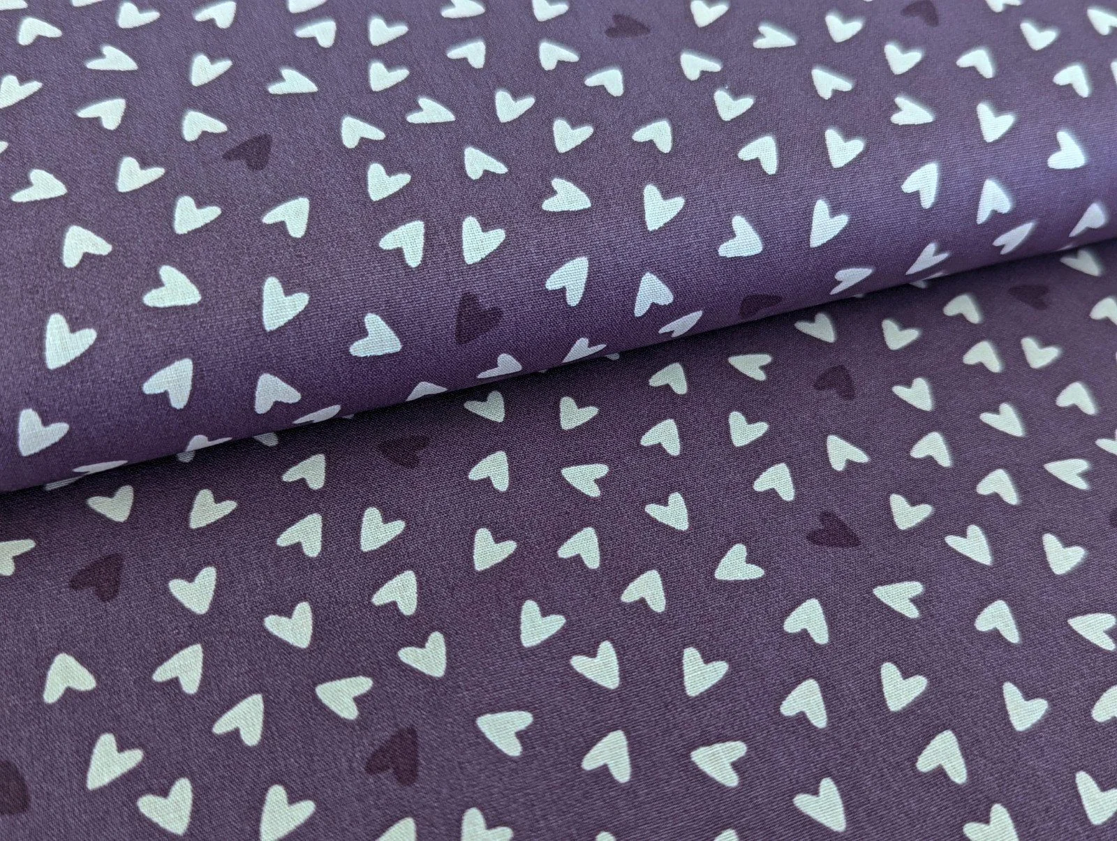 Niedlicher Baumwollstoff Poplin mit Sweet-Herzen-Muster auf lila Hintergrund. Perfekt geeignet für Kleidung, Kissen, Patchwork, Vorhänge oder andere kreative Näh- und Deko-Projekte. Vielseitig kombinierbar und auch für Kinderprojekte ideal.