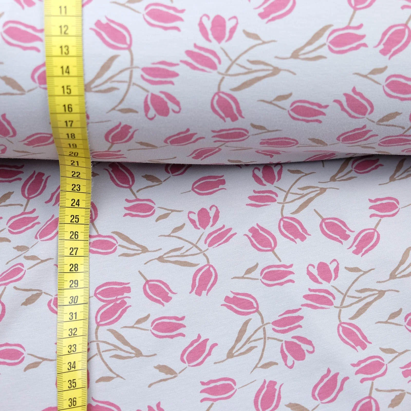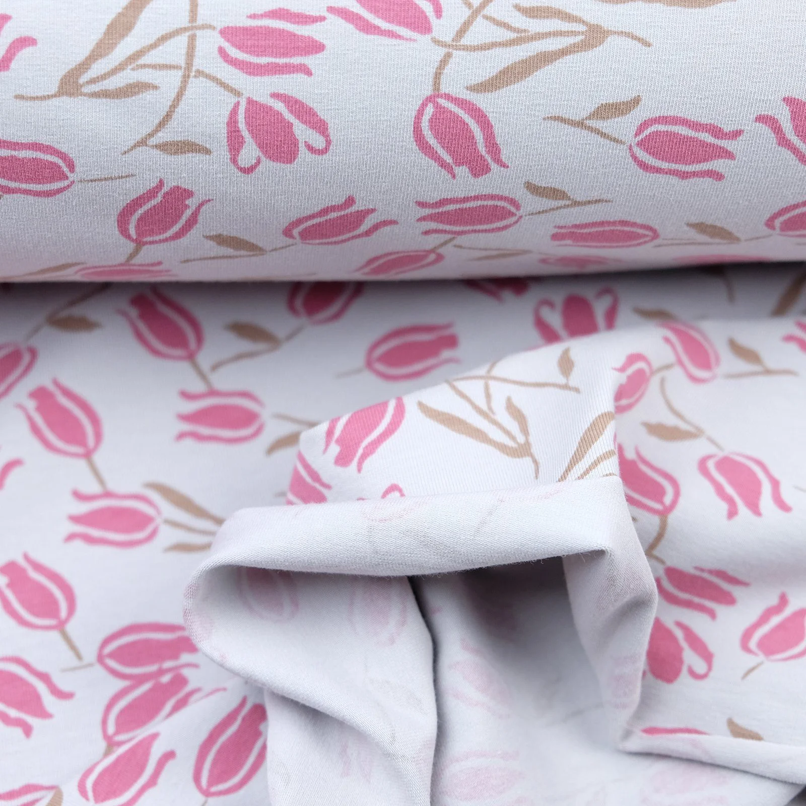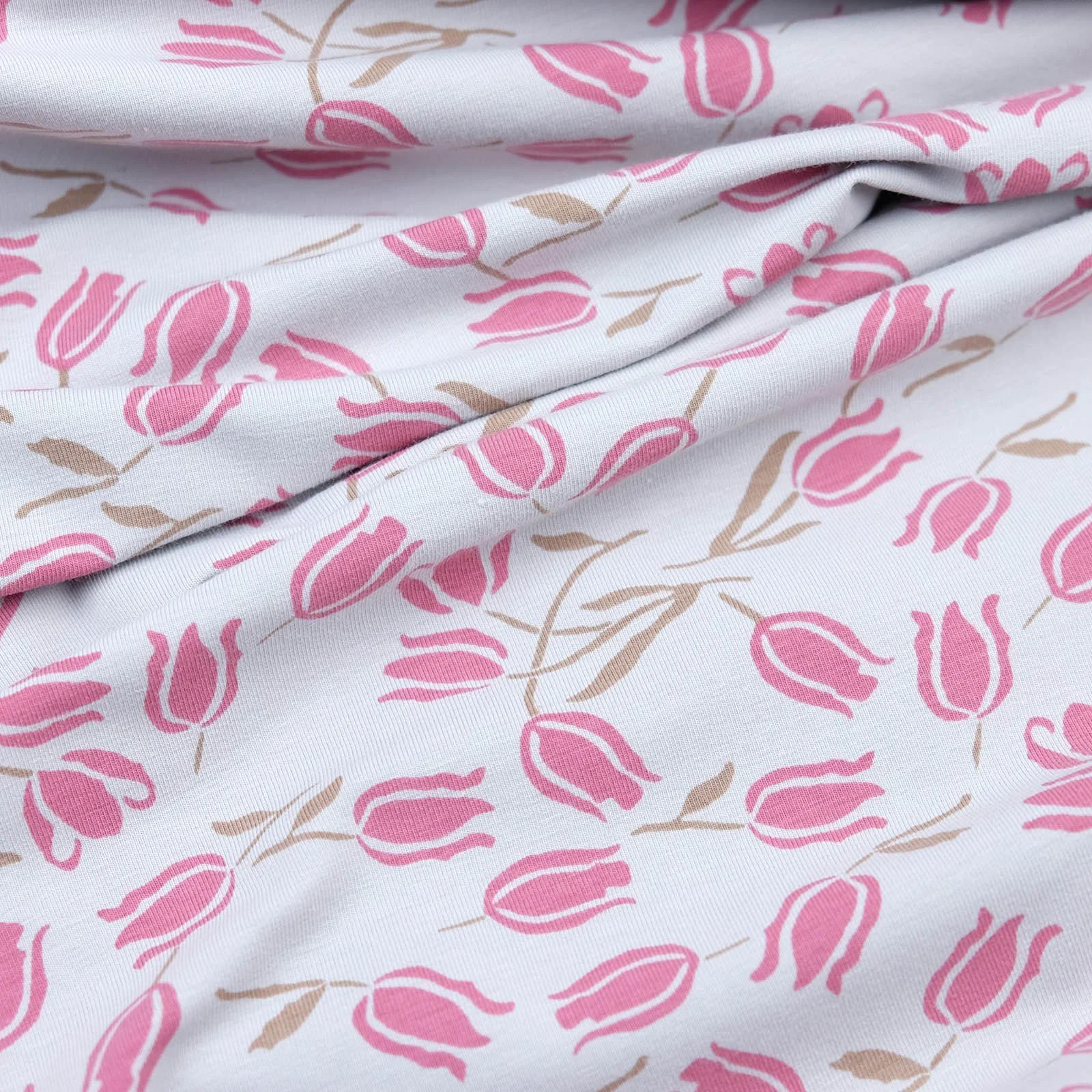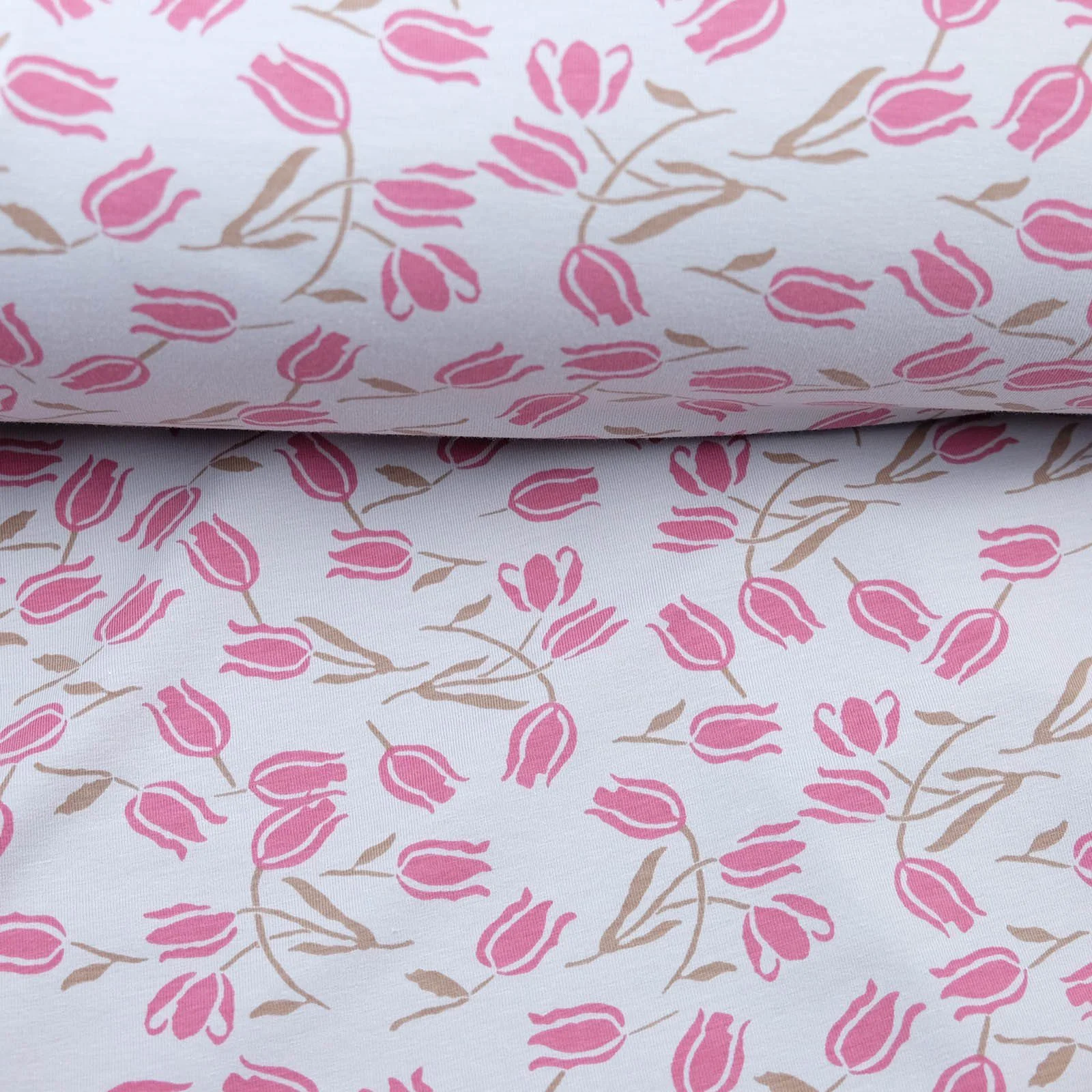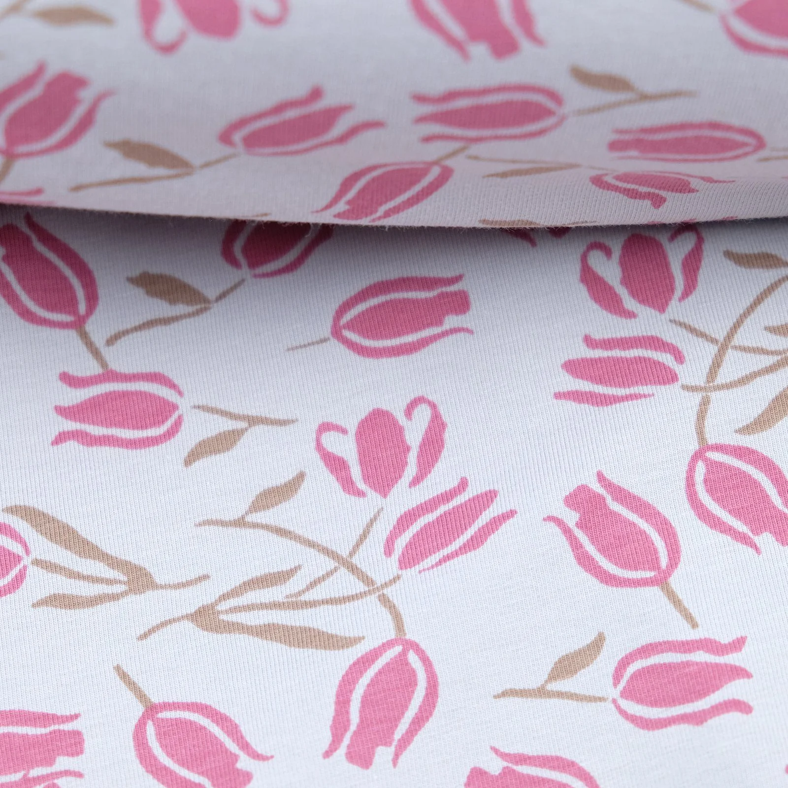 Hochwertiger Bio-Baumwolljersey mit elastischem Anteil, angenehm weich und feminin im Fall. Das florale Tulpenmuster in Magenta-Rot sorgt für zeitlos schöne Kleidung. Ideal für Shirts, Kleider, Leggings oder Beanies. Perfekt für nachhaltige Nähprojekte und langlebige Einzelstücke.