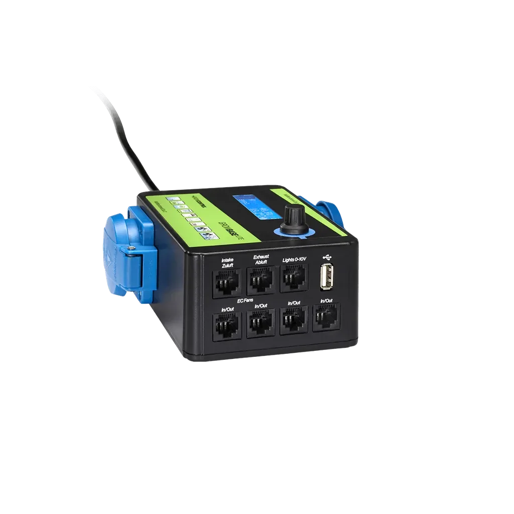 - Flexibel anschließbar: Mehrere RJ45-Ports für EC-Lüfter, Sensoren und 0–10V/1–10V-Leuchten; zwei programmierbare Steckdosen für AC-Geräte.