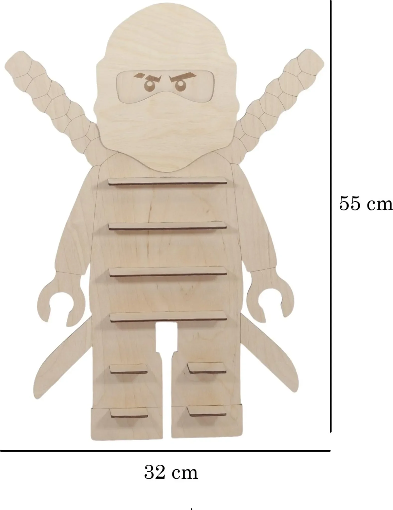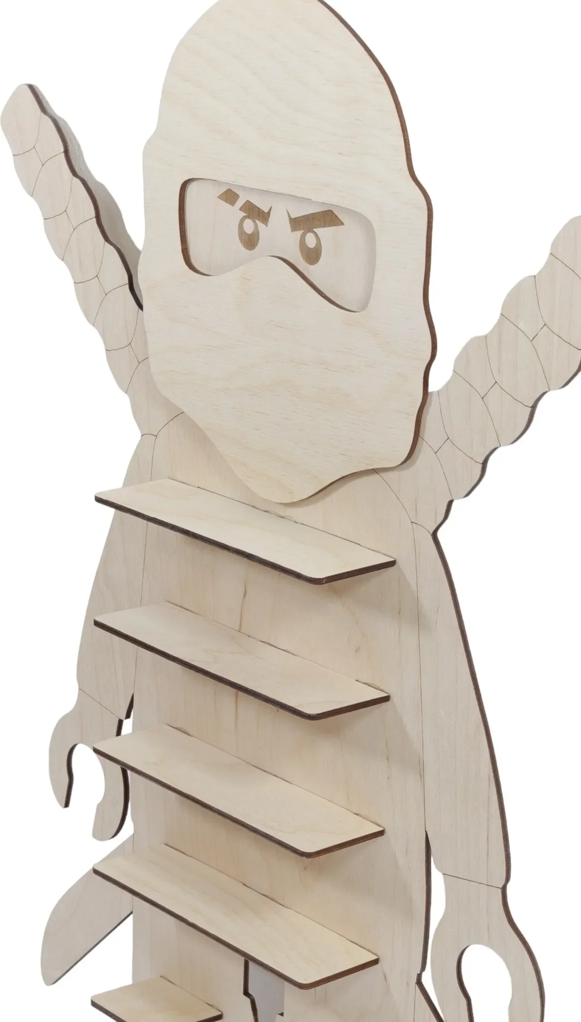 Der Regal-Aussteller „LEGO NINJA GO“ aus 4 mm Birkensperrholz ist perfekt geeignet, um LEGO-Figuren, Sammlerstücke oder Mini-Modelle stilvoll zu präsentieren. Das dekorative Holzdisplay bietet insgesamt acht Ablagen – vier längere Ablageflächen im oberen Bereich und vier kürzere am unteren Teil. Durch das markante NINJA-GO-inspirierte Design wird das Regal zum echten Blickfang im Kinderzimmer oder Spielzimmer.