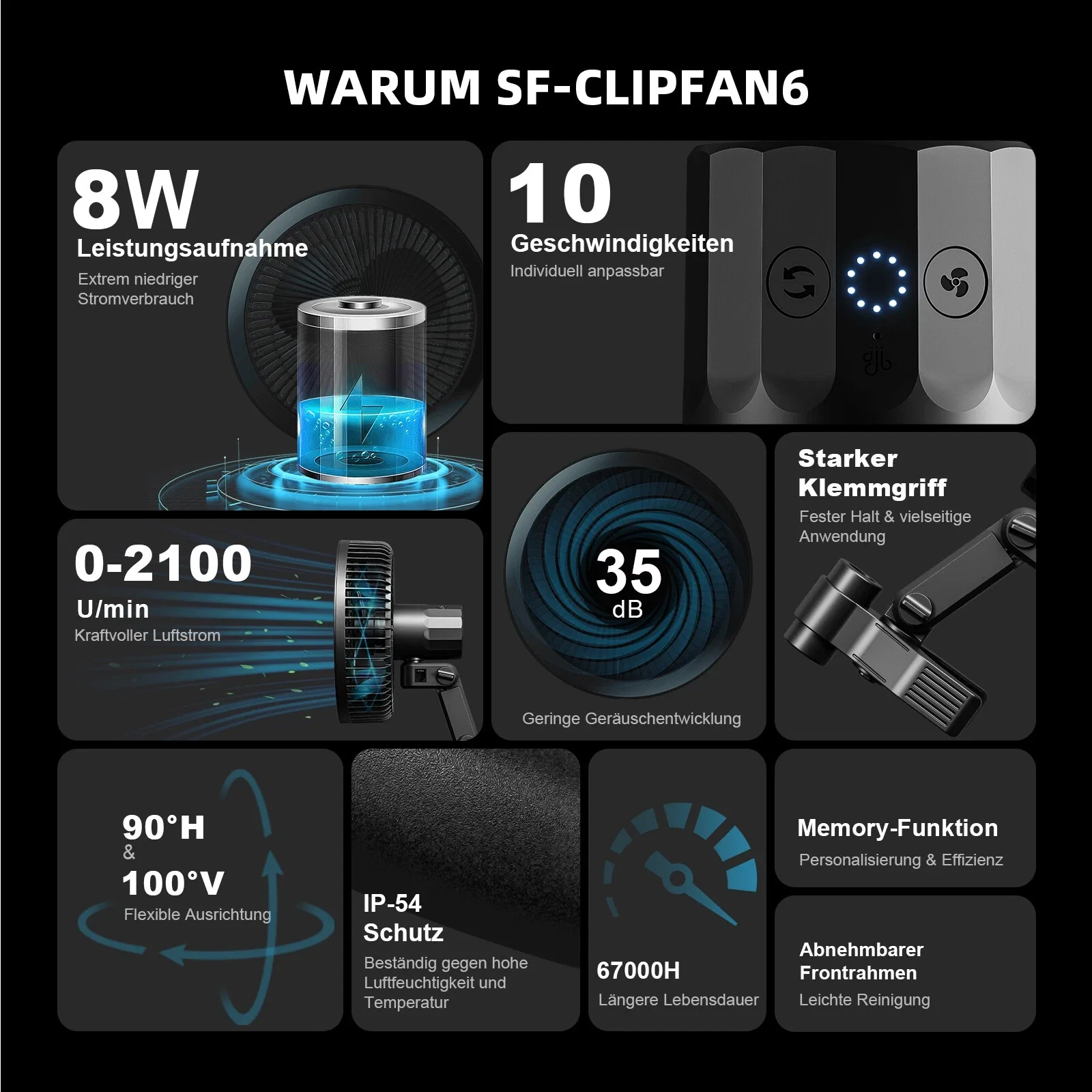 - Flexible Montage: Stabiler Clip und Schwenkfunktion für optimale Luftverteilung ohne tote Winkel.
