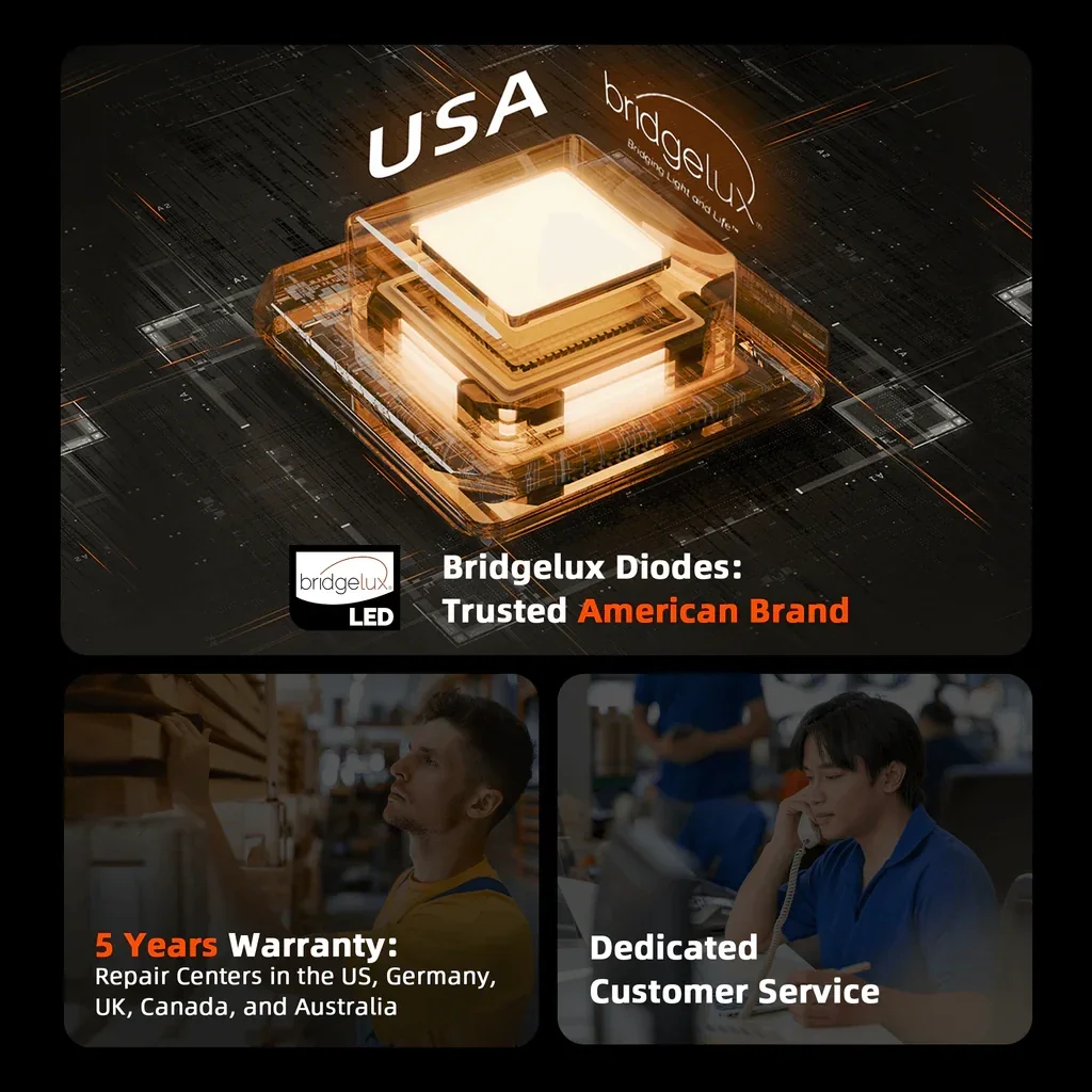 - Vollspektrum für alle Phasen: Warmweiß, Kaltweiß und Tiefrot (660 nm) decken Keimung, Wachstum und Blüte mit nur einer Leuchte ab.