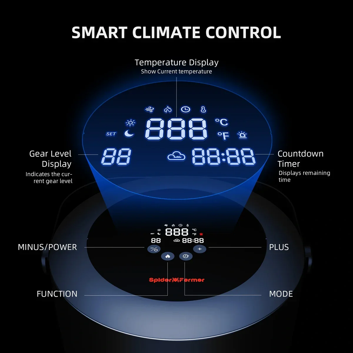 - Systemfähig: Optional integrierbar ins Spider Farmer GGS-Ökosystem über RJ12 für automatisierte Klima-Workflows.