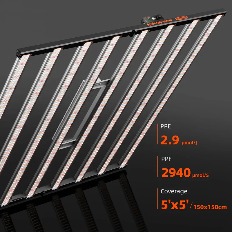 Die Spider Farmer SE1000 EVO ist eine 1000‑Watt LED-Growlampe für große Anbauflächen bis 150 × 150 cm. Ausgestattet mit Samsung LM301H EVO Dioden, hoher PPF von 2940 µmol/s und einer Effizienz von 2,9 µmol/J unterstützt sie dichte Bestände, kräftige Blüten und stabile Erträge – bei zugleich moderatem Energiebedarf. Die mehrteilige Bar-Konstruktion verteilt das Licht gleichmäßig, sodass auch Randbereiche homogen versorgt werden.