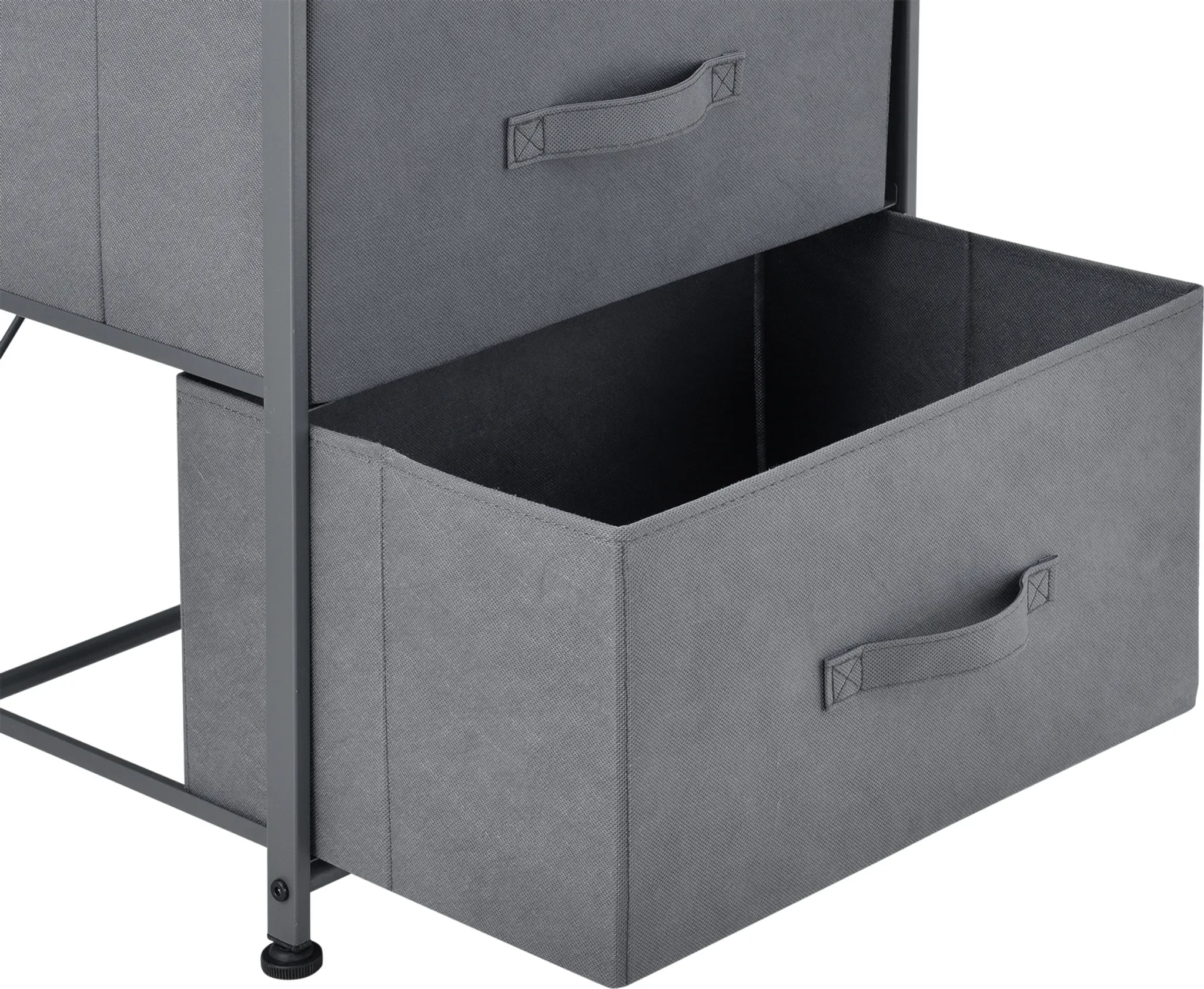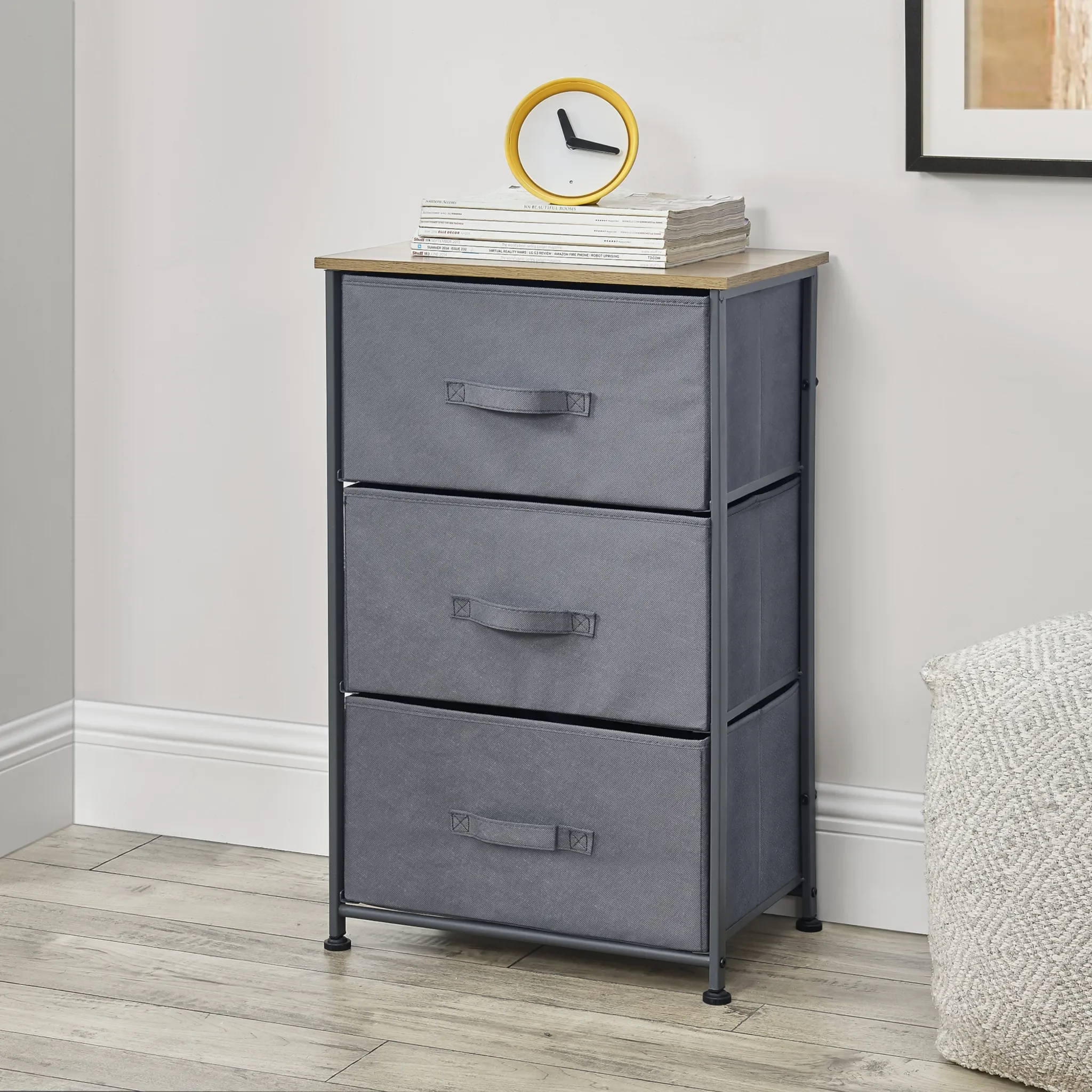 Diese praktische Kommode von [pro.tec] kombiniert modernes Design mit Funktionalität. Mit drei Vliesstoff-Schubladen und einer robusten Ablagefläche aus MDF bietet sie viel Stauraum für Kleidung, Accessoires oder Bürobedarf. Das stabile Metallgestell sorgt für Langlebigkeit und Stabilität, während die Kombination aus Grau und Holzfarbe stilvoll in jeden Raum passt.